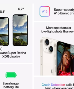iPhone 14. With the most impressive dual-camera system on iPhone. Capture stunning photos in low light and bright light. Crash Detection,1 a new safety feature, calls